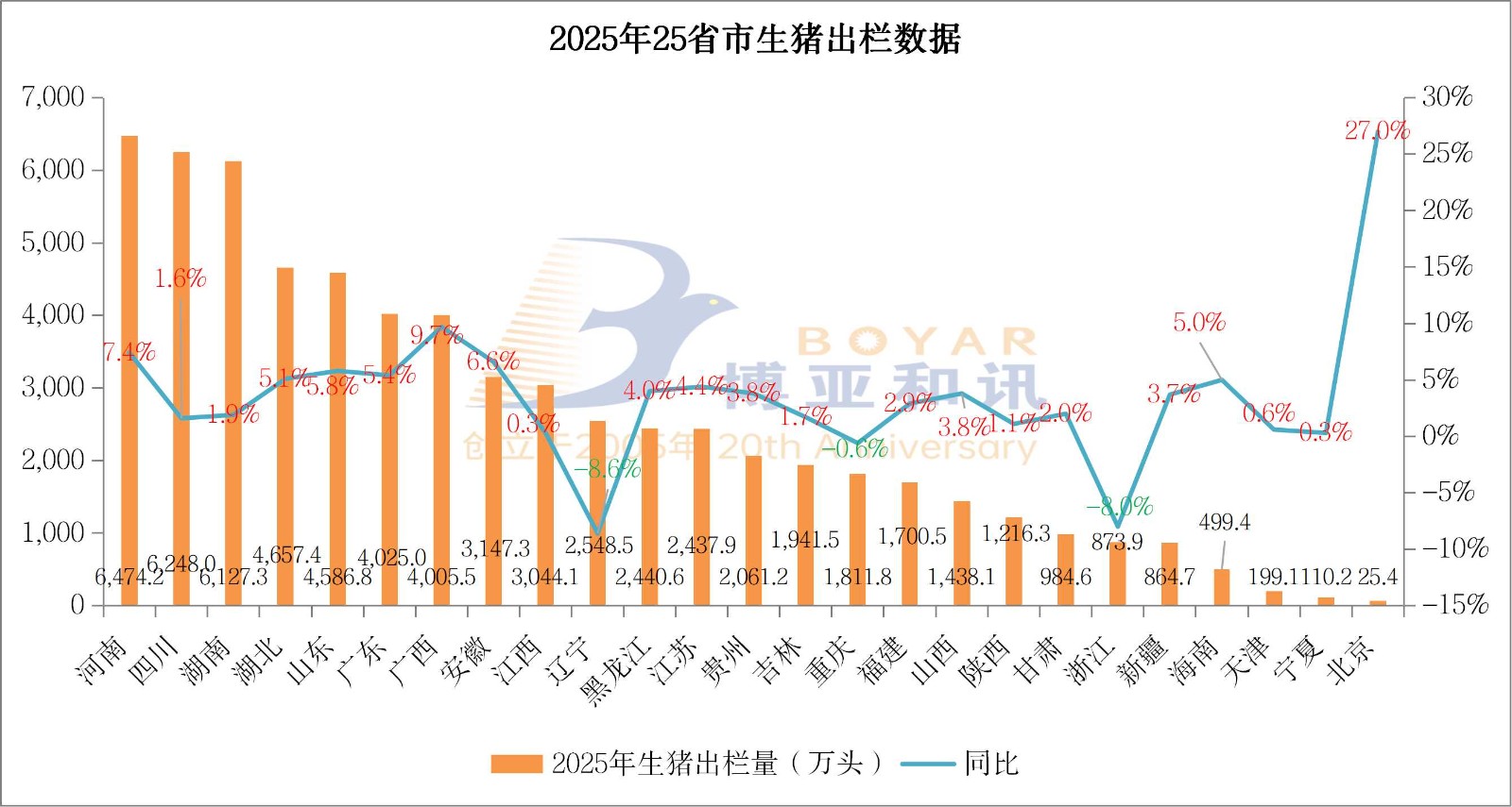 【BOYAR整理】2025年25省生猪出栏量大部增长,各省能繁母猪存栏多数转降,生猪产能回调